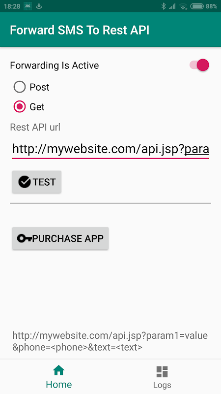 5. You can use this App to forward up to 500 SMS messages to your API server. After that you will have to buy an extension that will allow the App to be used for any number of SMS messages. The price is about 3.5USD
