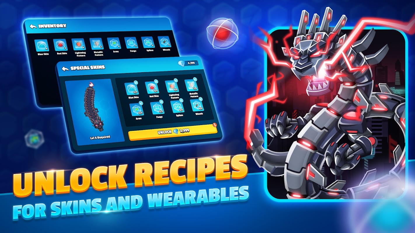با کشتن سایر مارها یا با گرفتن خرک که در مناسبتهای خاص ظاهر میشوند، صفات مختلف مانند رنگها، الگوها و پوشیدنیها را جمعآوری کنید. از صفات جمع آوری شده و ذخیره شده خود در موجودی خود برای ایجاد ترکیب جدید و ویژگی های تکامل یافته استفاده کنید. شما می توانید ترکیبات قفل نشده را برای ایجاد یک سبک منحصر به فرد از مار خود تجهیز کنید!