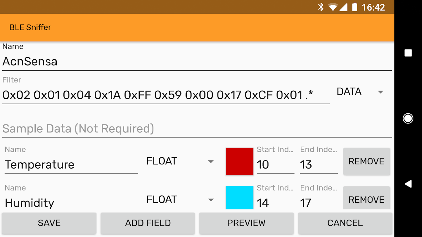 آن را خام داده تبلیغات BLE و deserialise آن را به انواع اولیه و رشته ای. این اجازه می دهد اشکال زدایی آسان تر و توسعه دستگاه BLE خود را. این می تواند داده ها در دو داده های خام و آدرس MAC با استفاده از عبارت منظم فیلتر کنید. شما می توانید انواع تبلیغات متعدد افتراق. شما می توانید deserialisers خود را با همکاران خود را با صادرات آنها را به یک فایل JSON به اشتراک بگذارید.