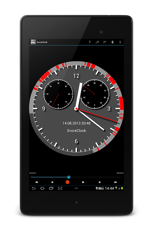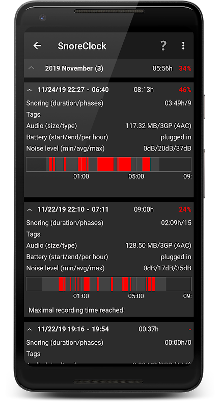SnoreClock تمام شب را ضبط میکند و خروپفهای احتمالی را با نوارهای قرمز برجسته میکند.