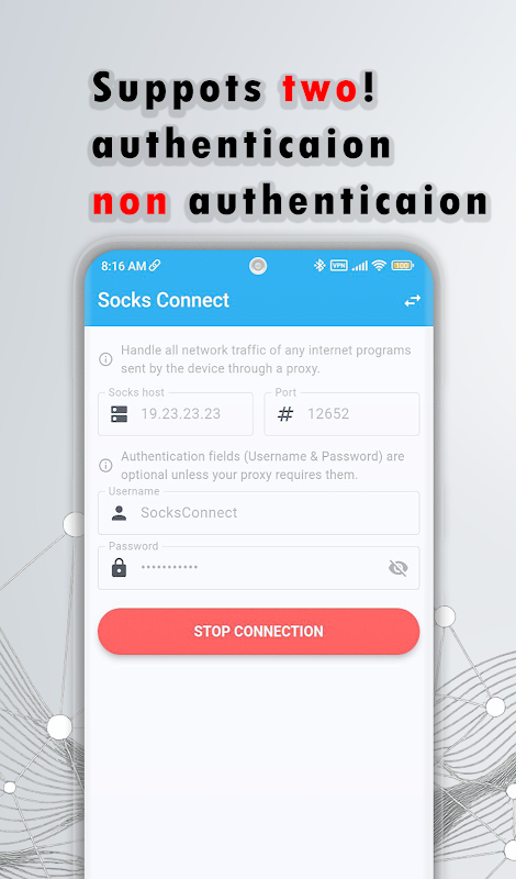 Socks Connct یک برنامه پروکسیفایر سبک و قدرتمند است که به شما امکان میدهد ترافیک اینترنت دستگاه خود را از طریق پراکسیهای سفارشی SOCKS به راحتی تونل کنید. چه از یک پروکسی با یا بدون احراز هویت استفاده کنید، Socks Connct از هر دو حالت با سازگاری کامل پشتیبانی می کند.