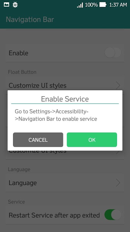 In order to use it, please turn on "Navigation bar" service from "Setting -> Accessibility ->Navigation bar."