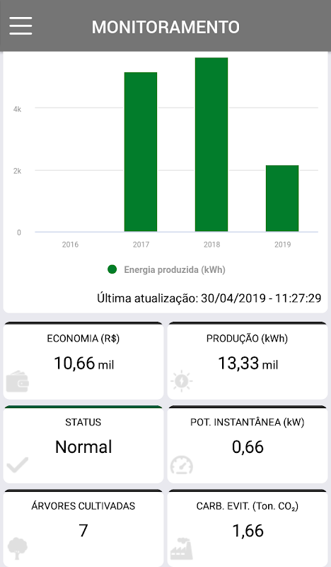 É possível visualizar a todo momento a produção solar, consumo de energia e as economias alcançadas.