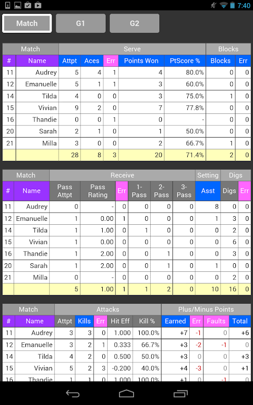 - آمار در رالی برای رتبه عبور، خدمت رتبه بندی، ضربه زدن، مسدود کردن و تلاش های حفاری