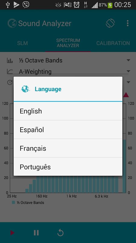 برنامه تحلیلگر صدا به شما امکان می دهد از تلفن هوشمند خود به عنوان یک سنج سطح صدا (SLM) و آنالیزور صوتی در زمان واقعی (RTA) استفاده کنید. سر و صدای محیط زیست ، اندازه گیری شده در دسی بل (dB) می تواند در زمان واقعی کنترل شود. حساسیت میکروفون با استفاده از منوی کالیبراسیون قابل تنظیم است.