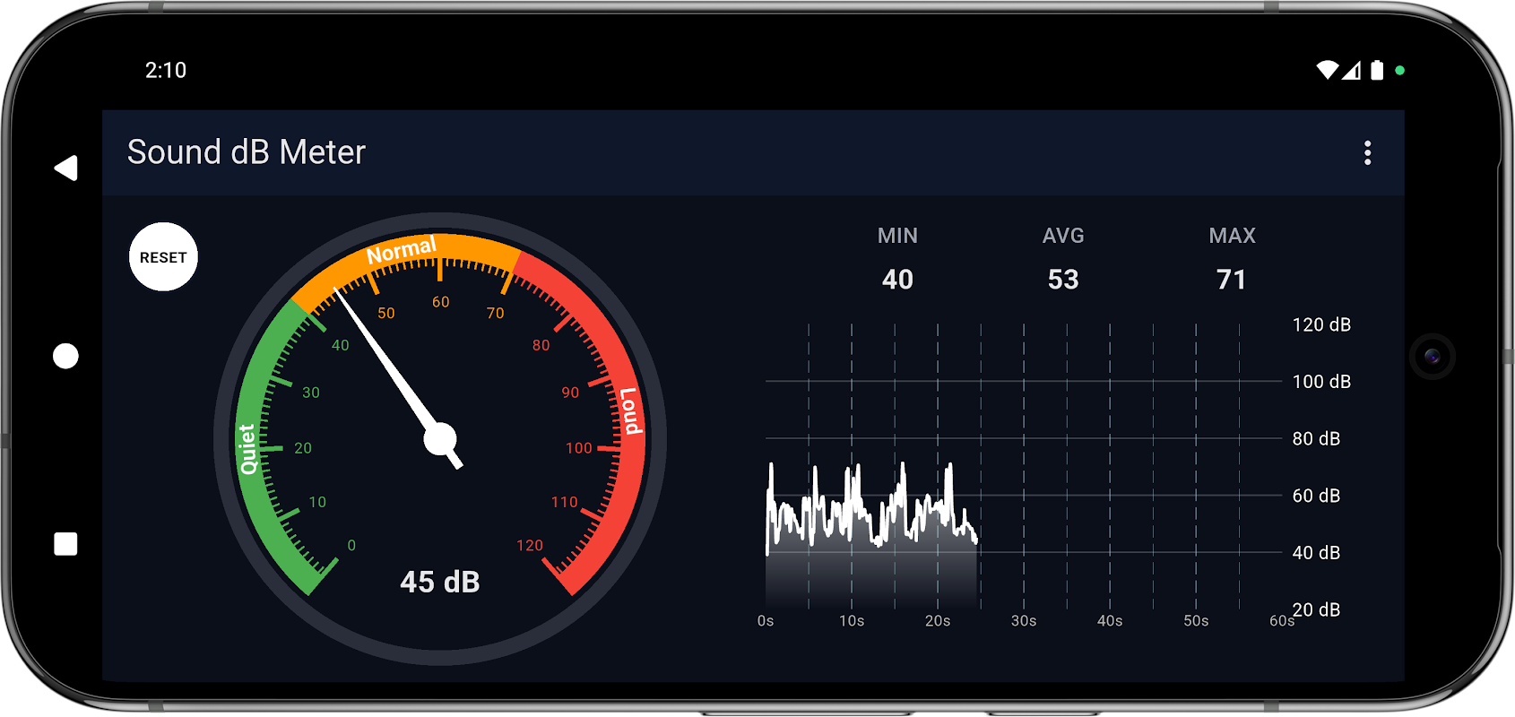 مناطق رنگی - به سرعت آرام (0-40 دسیبل)، معمولی (40-70 دسیبل)، بلند (70-120 دسیبل) را شناسایی کنید.