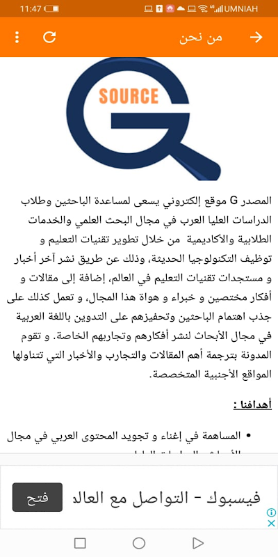المصدر G موقع إلكتروني يسعى لمساعدة الباحثين وطلاب الدراسات العليا العرب في مجال البحث العلمي والخدمات الطلابية والأكاديمية من خلال تطوير تقنيات التعليم و توظيف التكنولوجيا الحديثة، وذلك عن طريق نشر آخر أخبار و مستجدات تقنيات التعليم في العالم، إضافة إلى مقالات و أفكار مختصين و خبراء و هواة هذا المجال، و تعمل كذلك على جذب اهتمام الباحثين وتحفيزهم على التدوين باللغة العربية في مجال الأبحاث لنشر أفكارهم وتجاربهم الخاصة. و تقوم المدونة بترجمة أهم المقالات والتجارب والأخبار التي تتناولها المواقع الأجنبية المتخصصة.