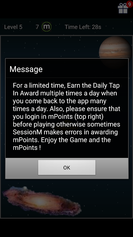 Not only do you help the alien get back to his home planet, but you also earn rewards right here on this planet ! You earn mPoints / mPlus rewards that can be redemeed for gift certificates and a variety of things (Please see details of the mPoints program). In this game, the number of mpoints you can earn at a level is mentioned on the screen. Each anti gravity bullet you use costs you one mpoint (don't worry, you don't get negative mpoints ... so your existing stash is safe !). In addition, you get 1 mpoint for every five times you manage to guide your ship via the bullet. You get mpoints till level 15 (you can continue playing after that though). The points quickly add up. You can earn more than 250 mPoints daily !!