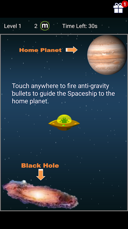 Your friendly alien's ship has lost propulsion and is stuck in deep space. The ship can rotate but can not otherwise move on its own. However, the alien does have a piece of technology that we don't - anti-gravity bullets - which to be honest, even we don't understand how they exactly work ! We do know though that the alien can rotate and fire anti gravity bullets which bounce off all matter (including blackholes) and even a gravitational boundary wall that aliens managed to create. The alien can use the energy of the anti gravity bullet to guide the spaceship in a particular direction ! Fortunately, the home planet is close by. Unfortunately, so is a massive blackhole. So, you have to be very precise in using these bullets or you will end up in the black hole !! But hurry, you only have a limited time to guide the spaceship !