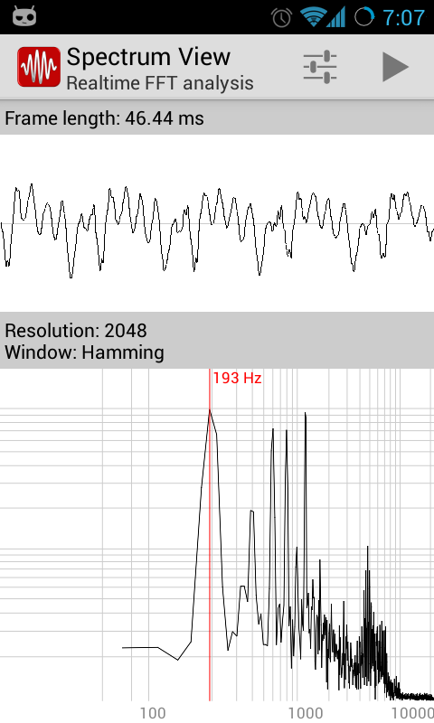 Spectrum view is a fast, real-time FFT analyzer which displays the sound waveform and its spectrum.