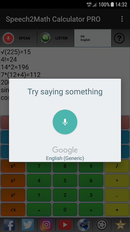 Speech2Math Calculator translates your speech to mathematical expressions. Speech2Math Calculator is an useful talking voice calculator application, which allows you to calculate easily by speaking. Speech2Math Calculator also has on-screen keyboard which allows you to edit expressions. Plus, minus, times, divide operations, square, cube square root, power, factorial operations are available. You can select the input speech language independent from your default device locale and language. Trigonometric functions such as sinus, cosine, tangent, arcsines, arccosine, arctangent and logarithmic functions are available in PRO version. Speech to Math Calculator is the only voice calculator which supports all the following languages and TTS (text to speech).