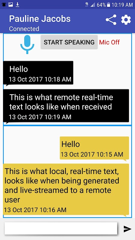 Their speech is then transcribed into text, error corrected, and streamed (in real-time) to each other’s smart phone. If a user opts not to speak, or is unable to speak, they can type what they wish to say using their smart phone’s virtual, physical, or Bluetooth keyboard. In the case of using speech to real-time text, words are streamed one-by-one. In the case of typing, words are streamed character-by-character, in real-time.
