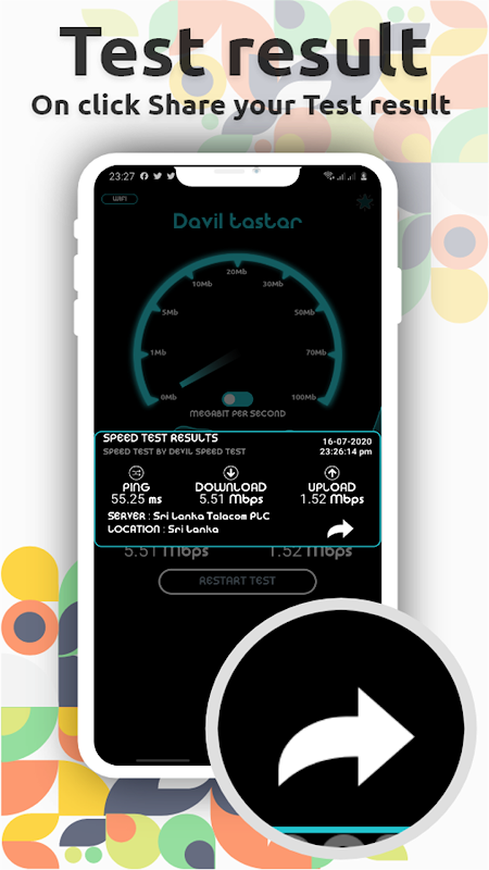 Additionally, you can share your SpeedTest result with another app of your choice with one click.