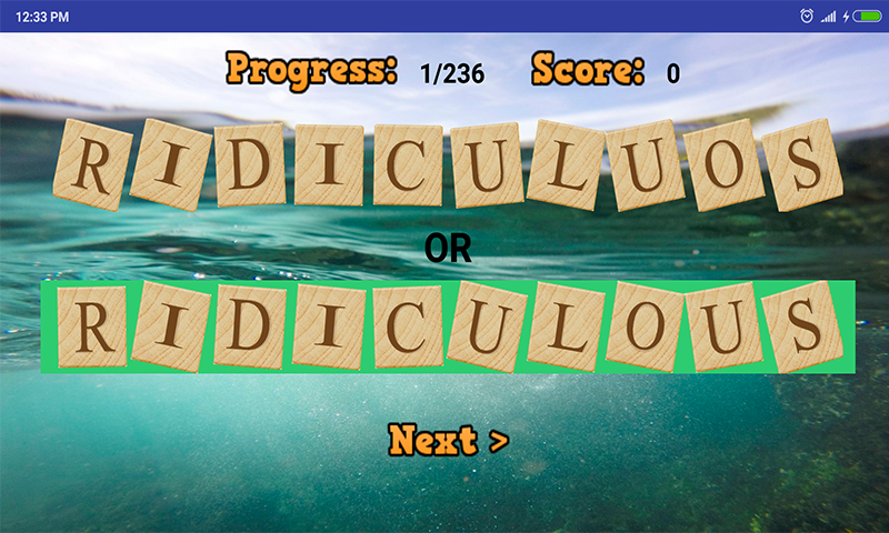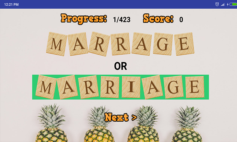 گیم پلی آسان و ساده است - دو نسخه از املا کلمات برای کاربر نمایش داده می شود - صحیح و نادرست است. کاربر باید کلمه ای را که به درستی نوشته شده است انتخاب کند.