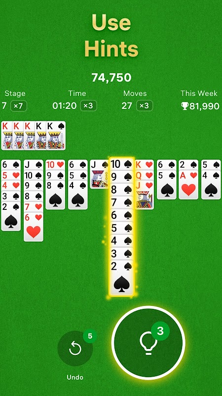 بهسادگی با ضربه زدن یا کشیدن کارتها، از تجربه روان Spider Solitaire لذت ببرید.
