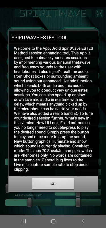 این برنامه به شنونده اجازه میدهد همزمان صدای میکروفون زنده و مجموعهای از صداهای تقویتکننده دوگوشی دوگوشی را داشته باشد، دستگاه را در نزدیکی جعبه ارواح قرار دهید تا صدای جعبه ارواح را از طریق میکروفون دستگاه ضبط کند، در پایین صفحه میتوانید تنظیمات صدا را در زمان واقعی مانند ولوم میکروفون و سرعت ضبط، 5 باند واقعی در جلسه و بهبود جلسه EQ تنظیم کنید.