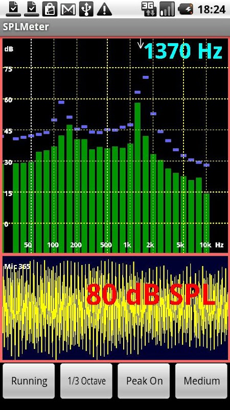 SPLMeter را نشان می دهد SPL (دسی بل) سیگنال میکروفون اندیشه، و طیف فرکانسی آنها. متر دارای سه سرعت: سریع، متوسط و آهسته است. پاکت اوج و فرکانس حداکثر شدت و اختصار نشان می دهد. ISO 1/3 میله اکتاو و طیف.