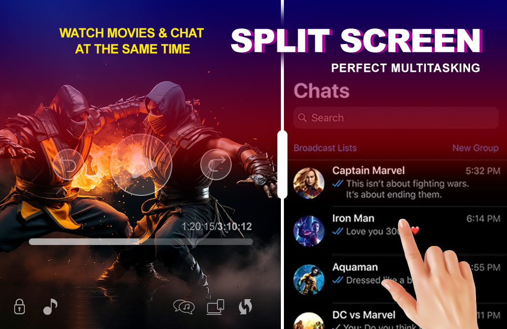 دو برنامه را روی صفحه راه اندازی کنید و چندوظیفه ای را بدون دردسر انجام دهید و بهره وری خود را افزایش دهید - بدون تغییر برنامه یا صفحه نمایش، همزمان گپ بزنید و فیلم تماشا کنید.
