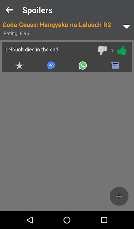 Did your friend start a series and you want to spoil it a little? Did you forget some of the interesting spoilers for that series? Well look no further, with Spoiler Alert the spoilers for all the series are available and are just one click away. Browse though tons of spoilers and send them to your friend through text message or even WhatsApp and Messenger. You can also add spoilers of your own choice to the list and make them available for the other users who want to tease their friends a little.