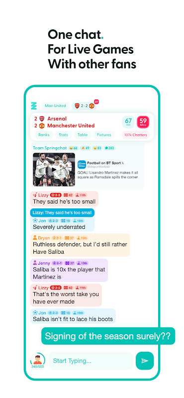 ما شما را با طرفداران دیگر در چت رومهای کوچک وصل میکنیم تا در حین تماشای یک مسابقه زنده به بحث و رقابت بپردازیم. ما ویژگیهای گیمیفیکیشن مرتبط با بازی زنده را داریم که میتوانید در حین چت از آن لذت ببرید و همچنین از طریق نظرات، آمار زنده و همچنین توییتهای پرطرفدار درباره بازیای که تماشا میکنید - در حین چت، تغذیه میکنیم.