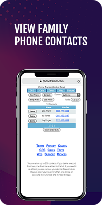 (1) داده های موقعیت مکانی GPS بر روی نقشه ترسیم شده (هر 30 دقیقه به روز می شود). 2. مخاطبین تلفنی که شامل نام و شماره تلفن هستند ، هنگام اتمام نصب ، تلفنی کپی شده و به حساب کنترل پنل شما ارسال می شوند. تمام این داده ها از طریق حساب کاربری که می توان در وب سایت ایمن ما در PhoneTracker.com ایجاد کرد ، به آدرس phonetracker.com به سرورهای ما ارسال می شود و 24 ساعت شبانه روز ، هفت روز در دسترس است.