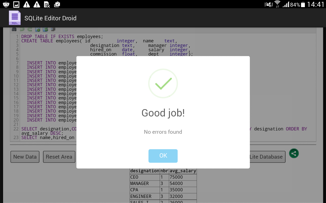 - تدوین و اعتبارسنجی کد و پیش نمایش فوری جداول SQLite.