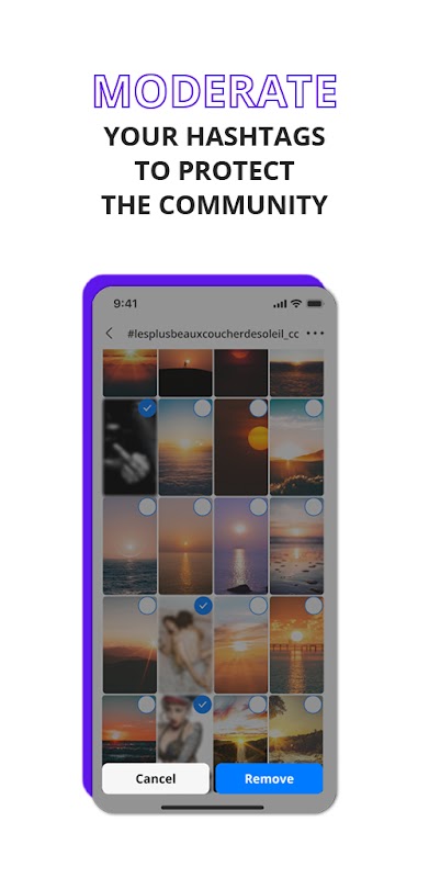 - با انتخاب نگه داشتن یا حذف عکس ها و ویدیوها و نظرات با یک کلیک، محتوای اضافه شده به هشتگ های خود را توسط انجمن کنترل کنید.