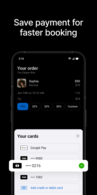 - با استفاده از کارت موجود در پرونده خود برای پرداخت ایمن برای خدمات و نکات، یکپارچه با پرداخت بدون تماس پرداخت کنید.