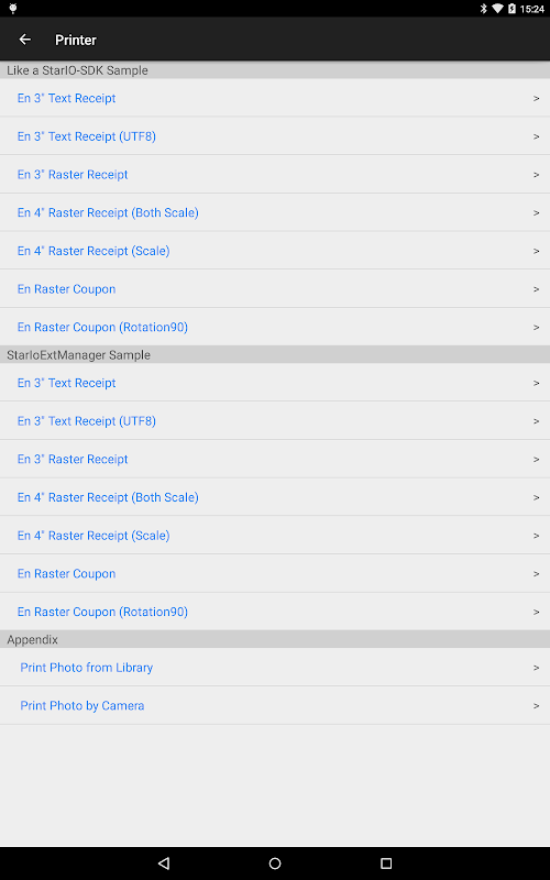 StarPRNT SDK Sample یک برنامه نمونه از پیش کامپایل شده است که از Star Micronics Mobile SDK موجود در "سایت پشتیبانی جهانی ستاره" ساخته شده است.