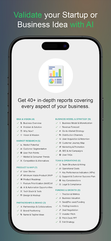 بیش از 40 گزارش دقیق ایجاد کنید که هر جنبه مهم یک استارتاپ را پوشش می دهد - از تحقیقات بازار گرفته تا استراتژی تامین مالی.