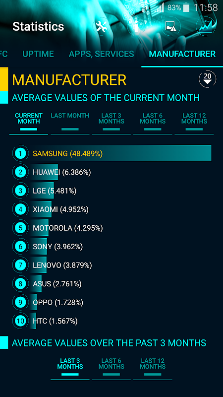 آمار و آمار نرم افزار فراهم می کند تا به روز و داده های آماری جهانی در 12 ماه گذشته برای گوشی های آندروید و قرص، همیشه به دستگاه خود را در مقایسه با.