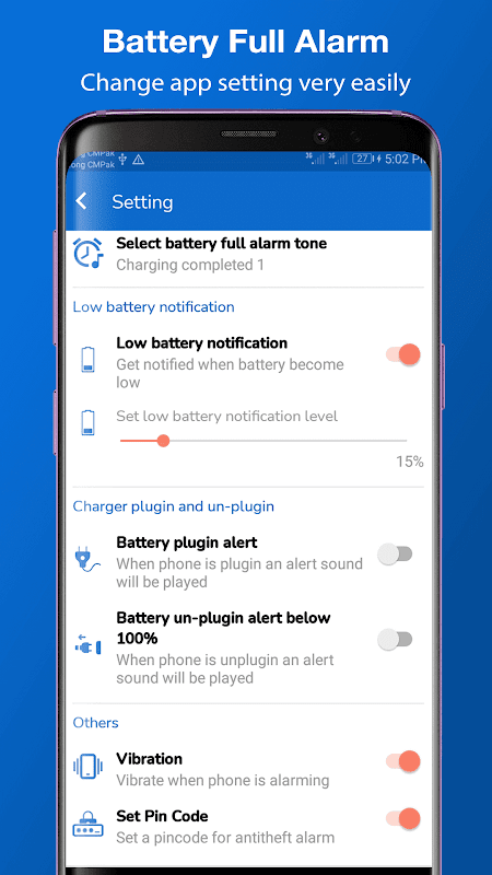 برنامه هشدار کامل باتری به منظور جلوگیری از آسیب دیدن باتری و همچنین صرفه جویی در مصرف انرژی ، برای محافظت در برابر شارژ بسیار مفید است. هشدار حذف شارژر نیز از ویژگی های بسیار شگفت انگیز است به طوری که هیچ کس نمی تواند تلفن شما را از شارژر جدا کند. وقتی کسی می خواهد تلفن شما را از شارژر جدا کند ، هشدار حذف شارژر فعال شده و به شما اطلاع داده می شود.