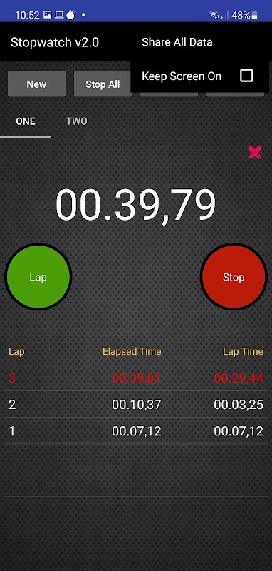 روی دکمه "شروع" کلیک کنید تا کرونومتر اجرا شود و روی دکمه "توقف" کلیک کنید تا آن را متوقف یا مکث کنید. شما می توانید با کلیک بر روی دکمه "Lap" هر دور را طی کنید و هر دور را در نمای جدول نمایش می دهد. با کلیک بر روی دکمه "اشتراک گذاری داده ها" می توانید داده های دور (تعداد دور، زمان سپری شده و زمان دور) را به اشتراک بگذارید.