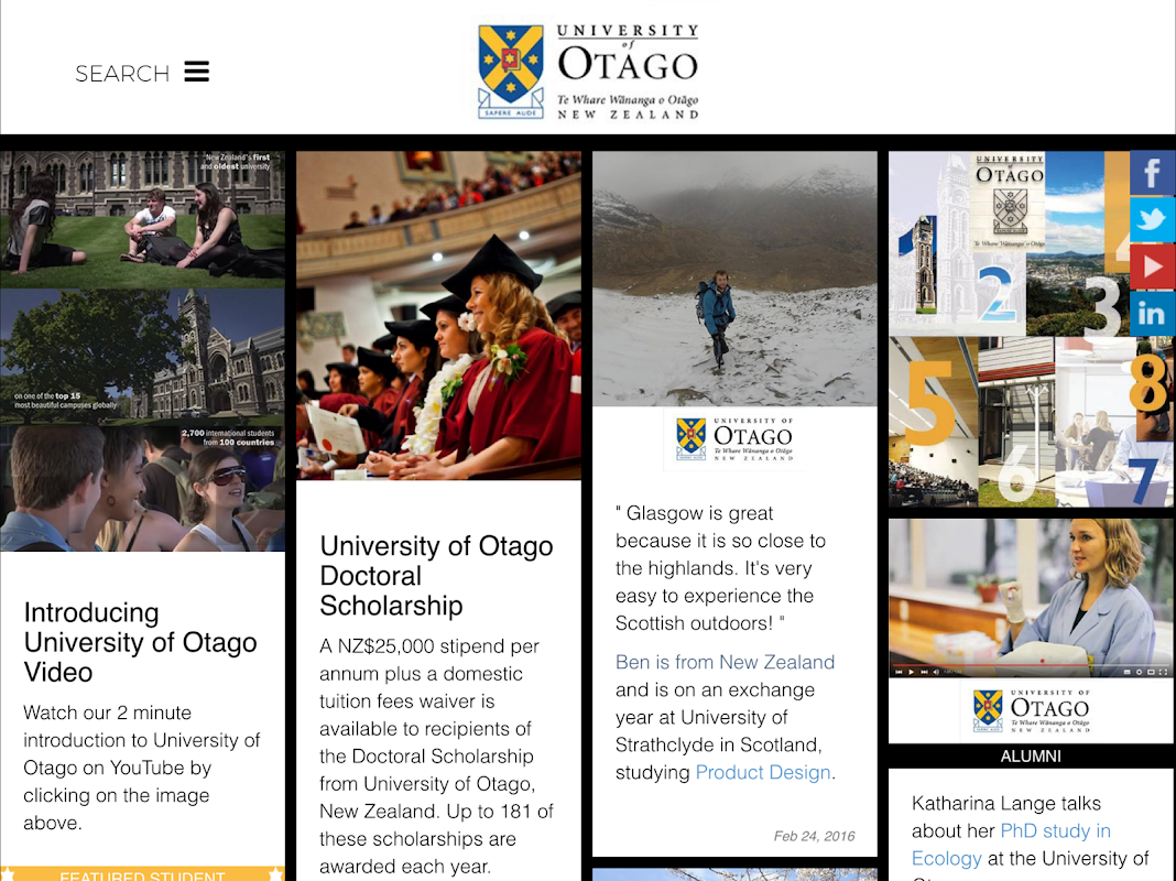 • Links to the University of Otago's International social media channels (Facebook, Twitter, YouTube & more)