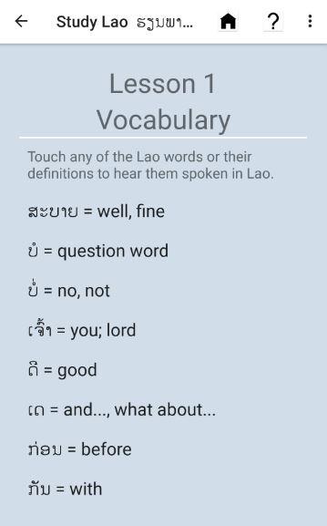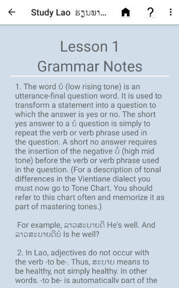 مطالعه لائوس شامل دو مجموعه از درس. اولین مجموعه به معرفی سیستم نوشتاری لائوس، با شروع با حروف الفبا. همچنین نشان می دهد که چگونه به ساخت و خواندن کلمات و جملات، تشخیص زنگ مختلف لائوس، تلفظ کلمات و در نهایت، آن را معرفی دستور زبان پایه لائوس. مجموعه دوم یک سری از 30 مکالمات طراحی شده برای ساخت مهارت های درک مطلب و افزایش درک دستوری از زبان لائوس است. هر درس مکالمه شامل یک سری لغات، با دستور زبان و تلفظ یادداشت که در آن لازم است.