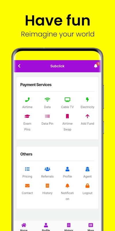 به SubClick، برنامه کاربردی تلفن همراه برای تراکنش های یکپارچه و مقرون به صرفه خوش آمدید. SubClick به شما امکان می دهد زمان پخش را با نرخ های عالی خریداری کنید، داده های مقرون به صرفه را به دست آورید، صورتحساب ها را تسویه کنید، و موارد دیگر.