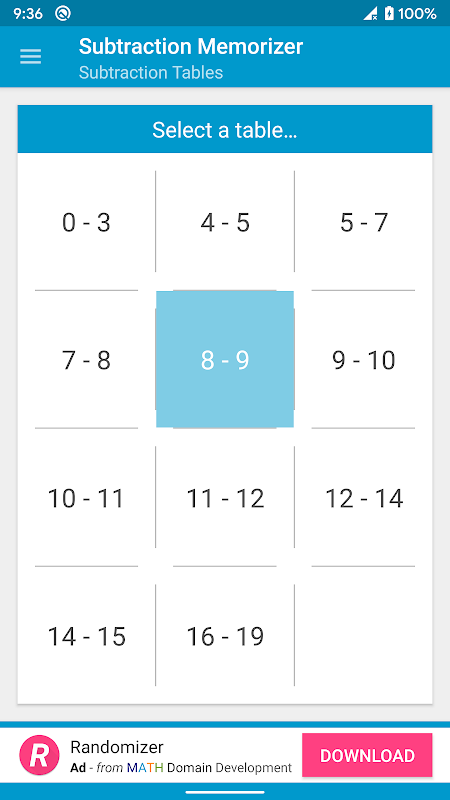 جداول تفریق یک محیط یادگیری بدون استرس را فراهم می کند. این یک کارت مدرن در مورد کارتهای فلش تفریق است. این ناحیه کل جدول تفریق تک رقمی را به صورت یک ردیف نمایش می دهد. در هر زمان می توانید پاسخ هر مسئله تفریق را نشان دهید یا پنهان کنید. هیچ سوالی وجود ندارد ، هیچ محدودیت زمانی ، هیچ ردیابی داده وجود ندارد.
