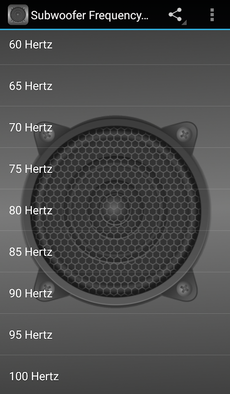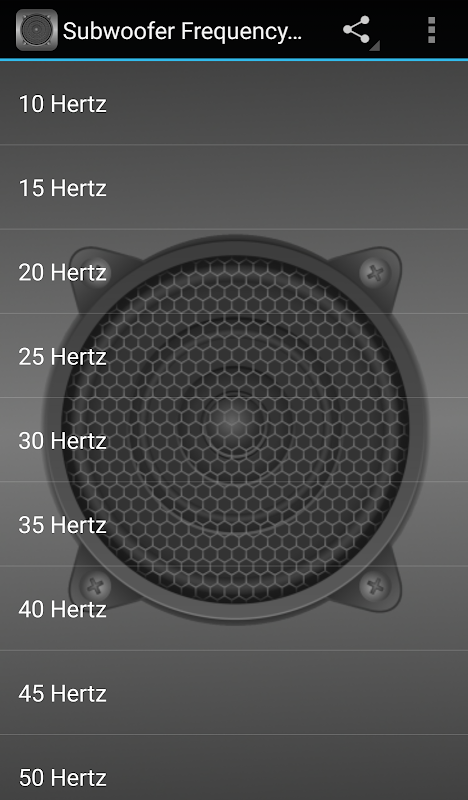 این برنامه ویژگی های دقیق فرکانس های پایین صدا وسیعی که اجازه می دهد شما را به آزمون توانایی های سخنرانان ساب ووفر خود را. فرکانس های صوتی در هرتز (هرتز) اندازه گیری شده و فرکانس های موجود در این محدوده برنامه از 15Hz تا از 100Hz، با صدای آزمون در هر افزایش 5HZ. از جمله آزمون برای تلفن های موبایل در افزایش 5HZ شما اجازه می دهد تا با دقت بیشتری با دقت اشاره کردن کمترین وسیعی که سیستم های صوتی خود را می توانید بازی. انسان می تواند شروع به شنیدن زنگ در حدود ورودی 20Hz، بنابراین داشتن یک سیستم صوتی با قابلیت به بازی برای تلفن های موبایل پایین تر از این به طور معمول لازم نیست!