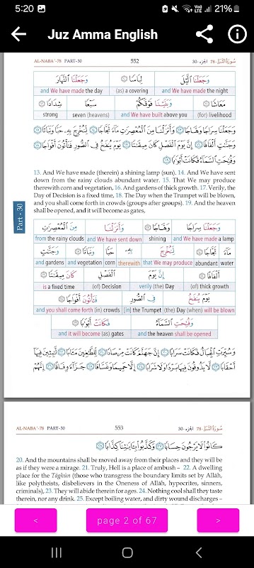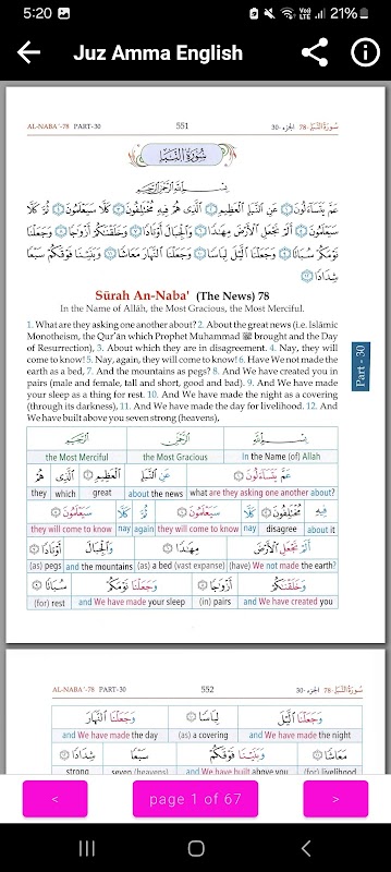 بدون نیاز به اتصال به اینترنت به متن کامل عربی و ترجمه کلمه به کلمه انگلیسی Juz Amma دسترسی داشته باشید.