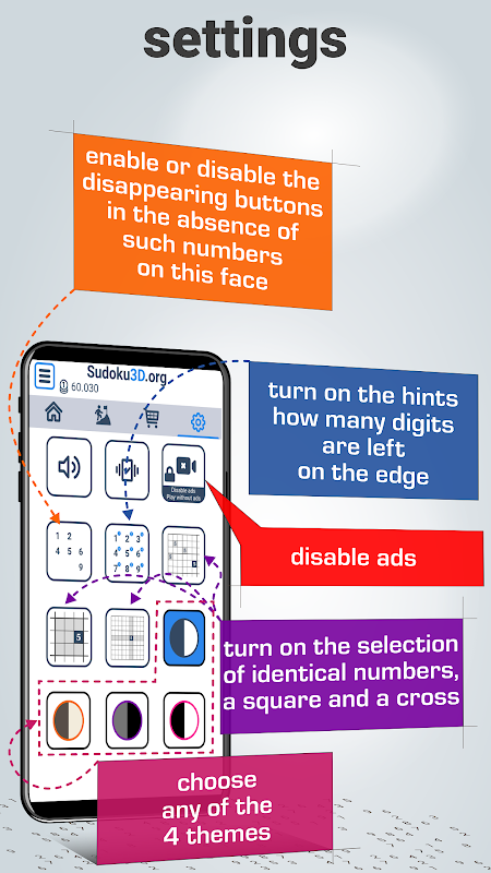 ◄ پیچیدگی سودوکو به تعداد سلولهای پرشده اولیه و روشهایی که برای حل آن باید اعمال شود بستگی دارد. در Sudoku3D 4 سطح دشواری وجود دارد. 1 سطح دشواری برای مبتدیان، 4 - برای حرفه ای ها.