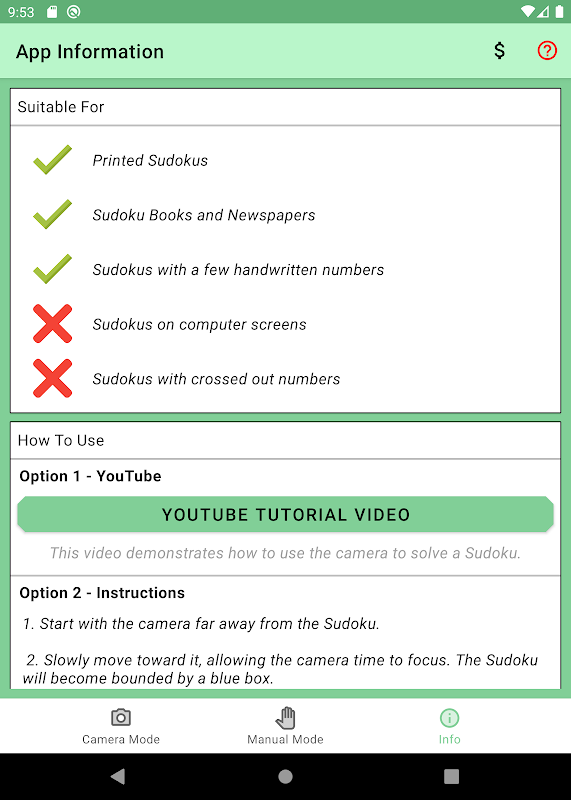 این برنامه در حال حاضر می تواند سودوکو خالی (بدون شماره دست نویس) یا شماره ای با چند شماره دست نویس را حل کند ، به شرطی که به وضوح نوشته شده باشد. اگر شماره های دست نویس به وضوح نوشته نشده باشد ، یا خط نوشته نشده باشد ، برنامه ممکن است مشکلاتی داشته باشد. اما نگران نباشید ، در صورت بروز هرگونه مشکل ، همیشه می توان از "حالت دستی" استفاده کرد.