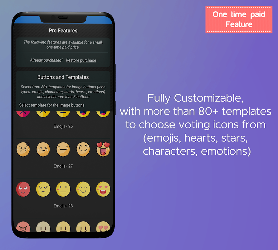 • قالب دکمه ها و تعداد دکمه ها: بیش از 80 قالب با تصاویر برای دکمه ها از انواع تم های آیکون مانند: ایموجی ، ستاره قلب ، شخصیت ، احساسات و همچنین امکان تغییر تعداد دکمه های تصویر از 3 به 4 یا 5