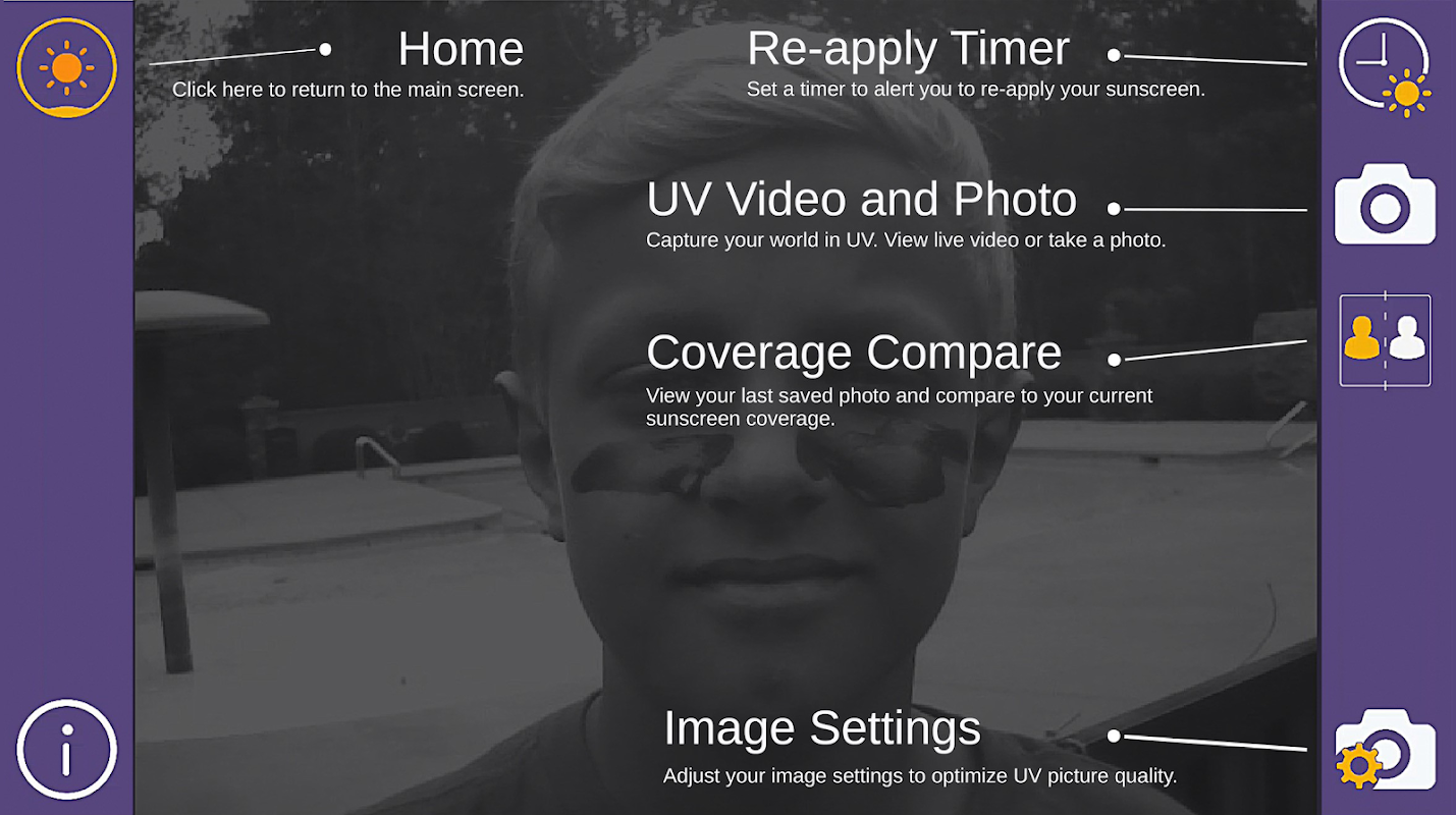 Since sunscreen's job is to absorb UV light before it hits your skin it looks dark when you look at it through Sunscreenr. Unprotected skin appears light. Sunscreenr is made possible by the combination of several key components: a special filter that removes all light except the part of the spectrum that sunscreen absorbs, a completely custom lens made from special materials and a carefully selected sensor that can actually respond to UV light. We combined that hardware with our proprietary image processing algorithms to show you the invisible, sunscreen on your skin.
