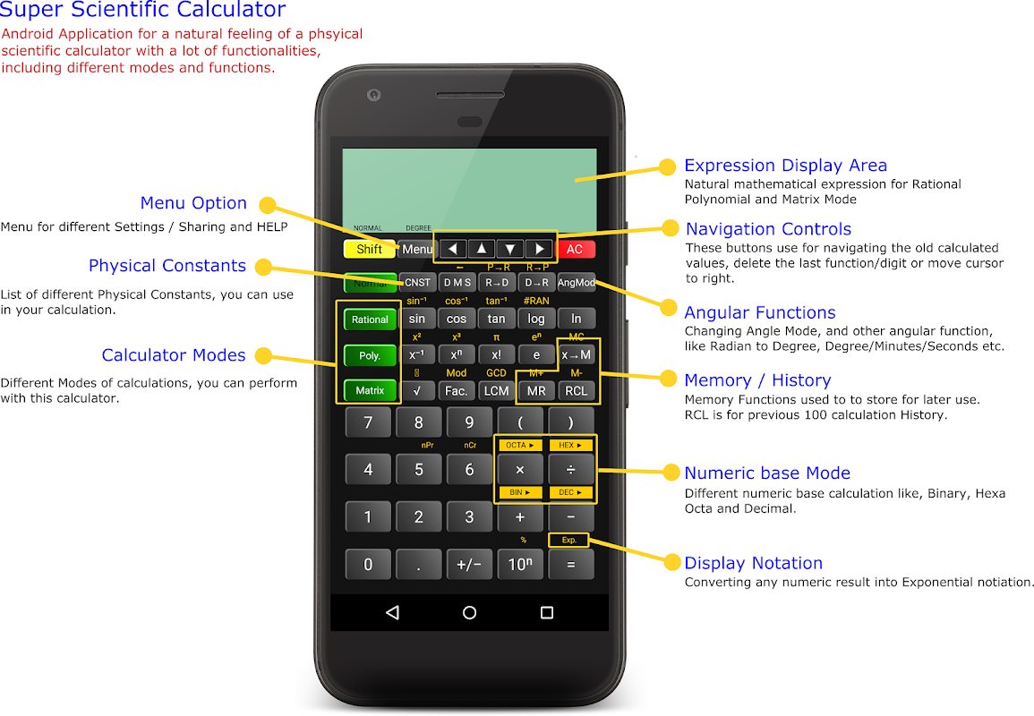 Super Scientific calculator is the best free scientific calc with different modes, including: