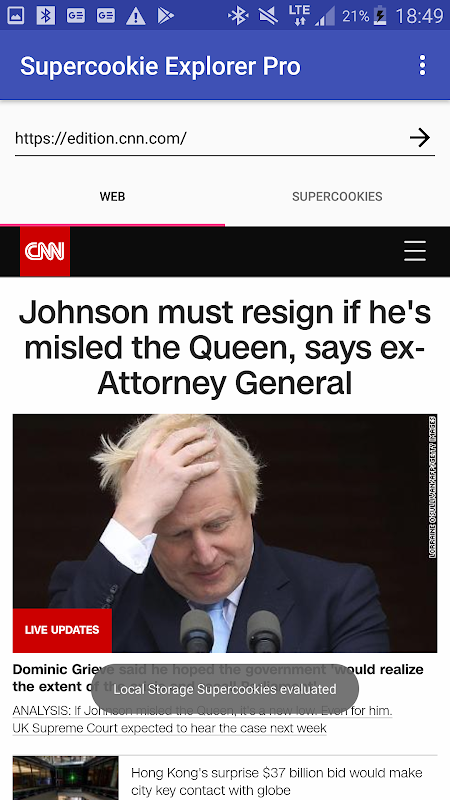 برنامه جایگزین مرورگر وب است. آدرس وب سایت به عنوان استدلال طول می کشد. پس از وارد کردن URL در قسمت متن و فشردن دکمه "برو" روی صفحه کلید مجازی ، وب سایت بارگیری می شود (منتظر اطلاعات مربوط به بارگیری کامل صفحه!) باشید ، سپس ابر ابرها ارزیابی می شوند (دوباره با اطلاعاتی که کاربر در مورد آن می خواند). سپس می توانید بر روی برگه "Supercookies" کلیک کنید و آنها را مشاهده کنید.
