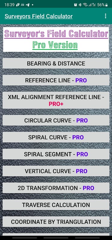 "ماشین حساب بررسی زمین" یک برنامه محاسباتی ضروری است که برای کار میدانی طراحی شده است. این طیف گسترده ای از محاسبات نظرسنجی مهندسی حمل و نقل را که برای کارهای پیمایش روزمره مورد نیاز است، پوشش می دهد. توجه به این نکته ضروری است که دقت نتایج به دست آمده از این ماشین حساب به ورودی دقیق و بدون هیچ اشتباهی بستگی دارد. بنابراین، ما به شدت توصیه می کنیم قبل از ادامه هر پروژه، نتایج را با سایر سیستم عامل ها بررسی کنید.