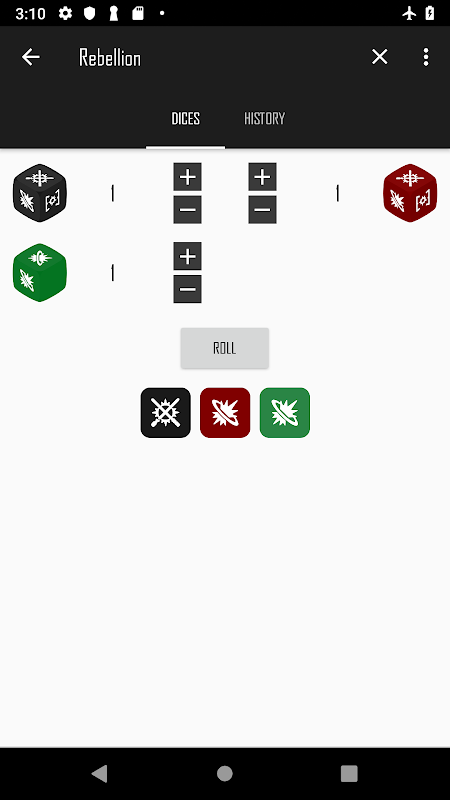 The "SW: Dice" application is the work of a fan. It is intended for entertainment and information purposes only, and is not endorsed by the above companies. If you desire to buy the above games, please visit https://www.fantasyflightgames.com/en/products/ for more informations.