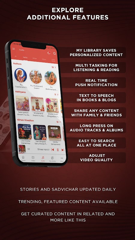 این نرم افزار دروازه ای دیجیتالی به مجموعه ای جذاب ، الهام بخش و معتبر از کاتا (گفتمان های معنوی) ، روح بلند کیرتان ها (ترانه های عبادی) ، مسحورکننده دهون (شعار معنوی) ، صدگران (کتاب های معنوی) ، وبلاگ های معنوی ، کتاب های صوتی و مجموعه های مختلف است. از انیمیشن سه بعدی ، دارشان روزانه (تصاویر خداوند متعال از مکانهای مختلف زیارتی) ، Shibir-Mahotsav ، Chandan na Vagha ، برنامه های فرهنگی ، فیلم های تلویزیونی ، Yatra-Pravas ، آگاهی ، Hindola-Abhishek و سایر رسانه های دیجیتال فرقه Swaminarayan.