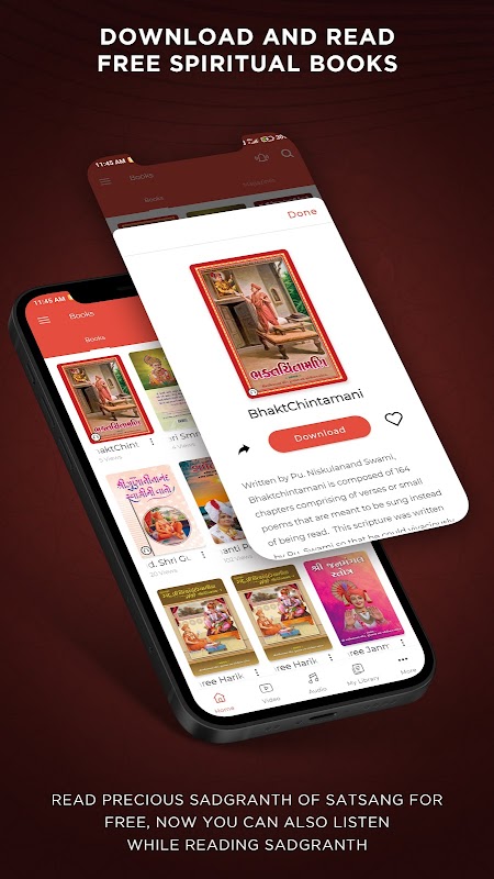- کتابهای معنوی مانند Vachnamrut ، Swami ni Vato ، Shreeji ni Lila و بسیاری از کتابهای Kirtan (ترانه های معنوی) با ویژگی هایی مانند صوتی برای افزایش تجربه خواندن ، توضیح ساده کلمات منطقه ای ، کتاب مقدس و فلسفی ، بارگیری آفلاین ، جستجو در کتابها و جستجوی جهانی ، برجسته کردن و نوشتن یادداشت ، نشانک گذاری ، آوانویسی ، پیمایش خودکار ، به راحتی محتوای مورد علاقه خود و حالت شبانه را به اشتراک بگذارید.