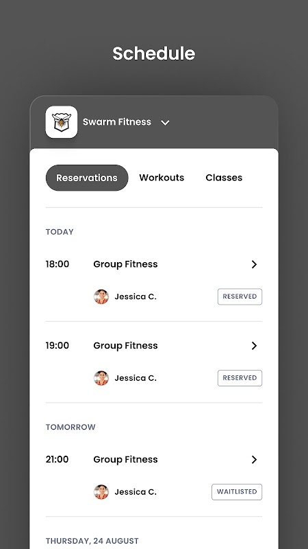 برای اینکه اعضای Swarm Fitness جای خود را در یک کلاس رزرو کنند، در رویدادهای باشگاه و مدیریت عمومی حساب کاربری مانند بهروزرسانی عکسها و کارت اعتباری موجود در پرونده ثبتنام کنید.